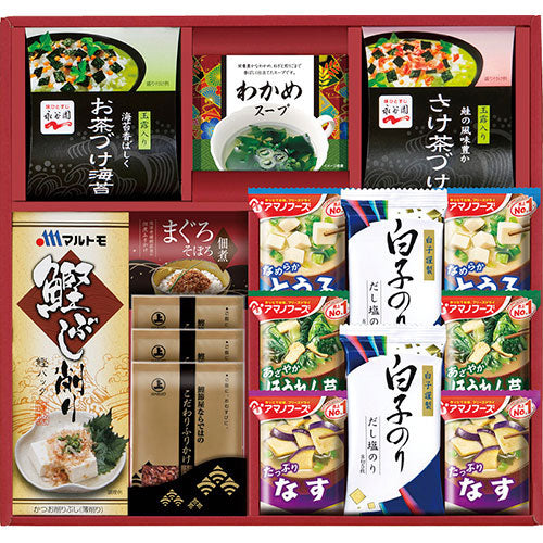 セット内容 : こだわりふりかけ(6g)×3、アマノとうふおみそ汁(10g)・アマノなすおみそ汁(9.5g)・アマノほうれん草おみそ汁(7g)・白子だし塩のり(8切5枚)×各2、まぐろそぼろ佃煮(7g×2袋)・永谷園お茶づけ海苔(6.3g×3袋)・永谷園さけ茶づけ(5.6g×3袋)・わかめスープ(5.3g×2袋)・マルトモ鰹ぶし削り(2g×6袋)×各1